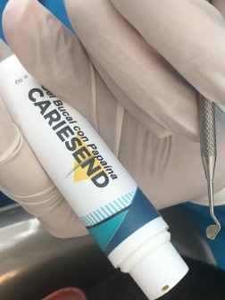 El tratamiento en casa se hace después del cepillado, aplicando una gota sobre la caries visible, se deja actuar por dos minutos y se retira con un algodón, para caries más profundas se recomienda visitar al odontólogo. En el consultorio se utiliza la cureta, para retirar el tejido cariado después de aplicar el gel Cariesend. Finalmente el odontólogo, repara el diente con resinas del mismo color del diente afectado. El gel cariesend debe aplicarse sobre el diente, tan pronto como pueda ver la lesión, de manera que impida el avance de la infección por caries. Mas adelante cuando pueda visitar el odontólogo, un estudio radiográfico y una revisión en detalle podrá descartar caries ocultas y reparar con resinas las lesiones tratadas en casa.